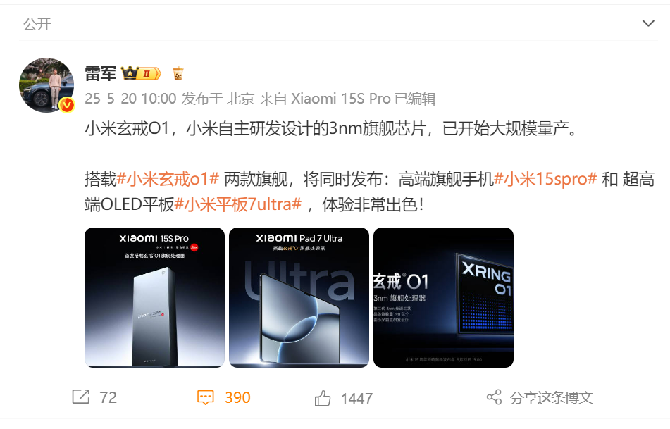 5月20日,小米集团董事长雷军在微博发文称,小米玄戒O1,小米自主研发设计的3nm旗舰芯片,已开始大规模量产。