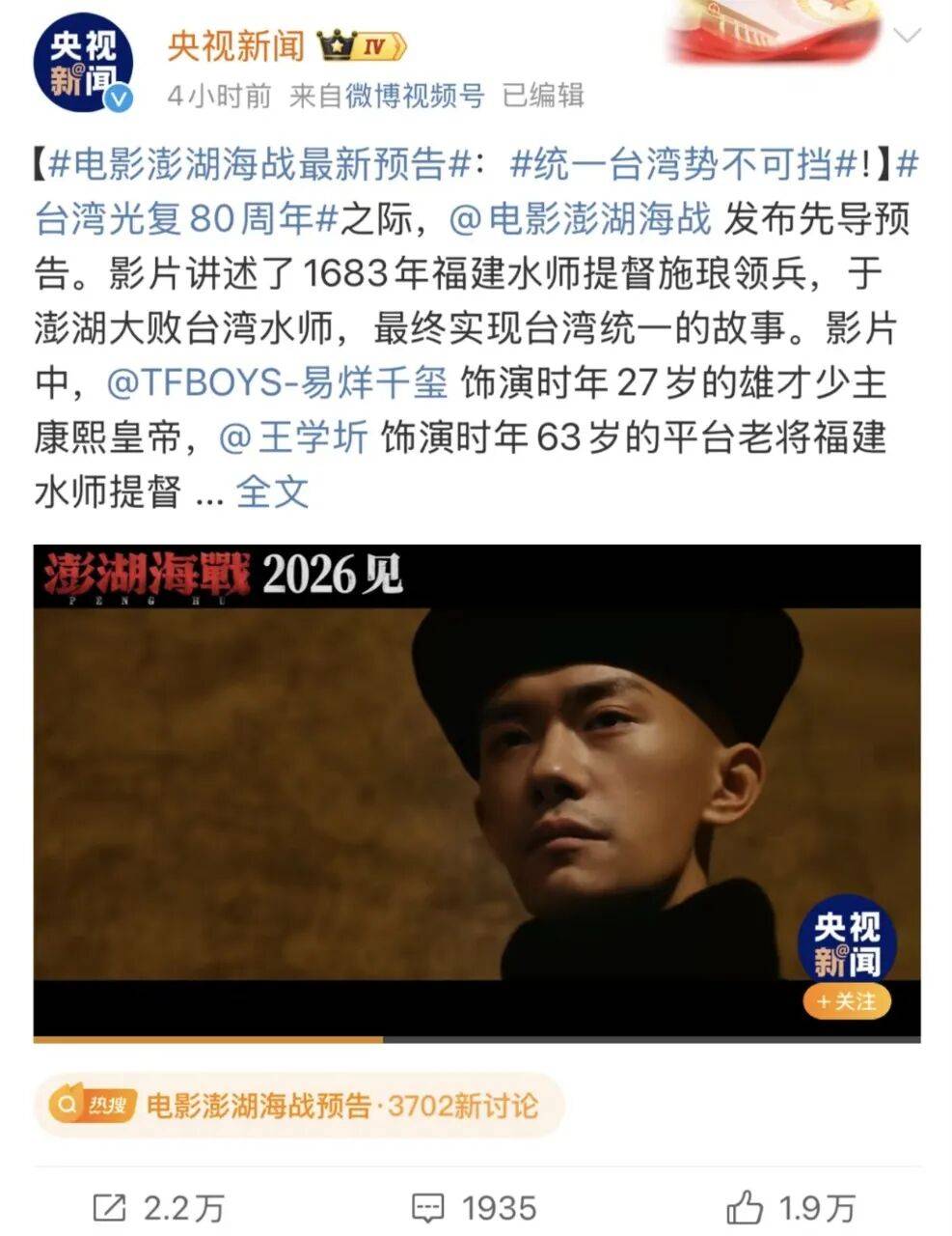 易烊千玺客串的电影《澎湖海战》,影片预告片一出,千玺扮演的康熙形象就引发了热议。
